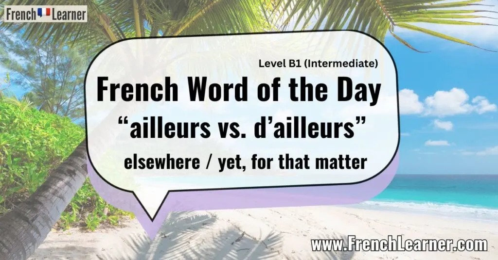 The French word of the Day are ailleurs vs. d’ailleurs, which have very different meanings. Ailleurs means ‘elsewhere’. D’ailleurs has many translations including ‘yet’, ‘for that matter’, ‘incidentally’ and ‘moreover’.