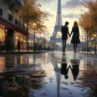 A romantic 1950s Paris street scene in spring, with a couple walking arm in arm under blooming cherry blossoms, inspired by the song “C’est si bon.”